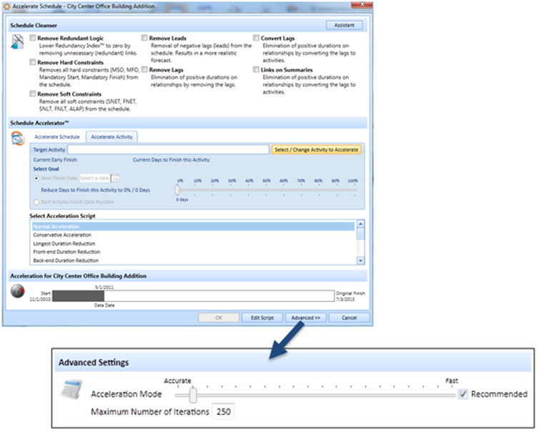 Click Advanced >> on the Accelerate Schedule dialog box to manually override the level applied so that an even more accurate, or alternately, a faster but less accurate model can be run.