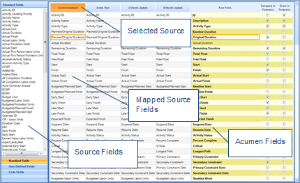 When you click the Current Schedule column, the data fields included in the Current Schedule project display on the left side of the screen. Click the Standard, User Defined, or Code Fields buttons to display the fields included in the project or snapshot files. The fields that are already mapped to Acumen display in the project/snapshot column as well as in the Deltek Acumen Fields column (the Acumen field name may be different than the project/snapshot field name).