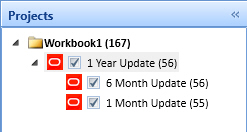 This example shows a workbook containing a single primary project with two snapshot projects assigned. This hierarchy provides the basis for running a forensic analysis.