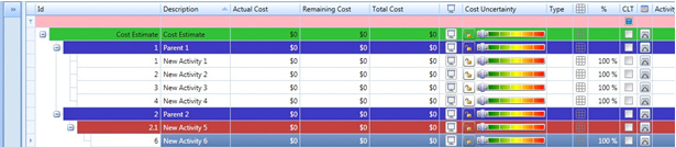 You can create any number of hierarchical levels or groups in the cost estimate. Any time an activity, or group of activities, is dragged onto another row, it becomes a child of that row.