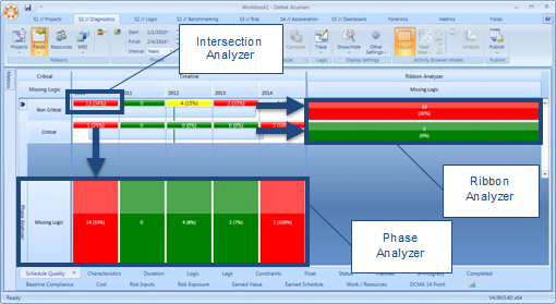 The Acumen analysis engine can analyze across multiple phases as well as segment data by ribbon. The analysis engine automatically calculates duration, cost, and work across phase boundaries and spreads values accordingly.