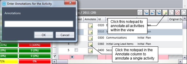 To add notes or annotations to the metric results, use the notepad icon found in the Activity Browser. You can annotate a single activity or the entire Activity Browser.