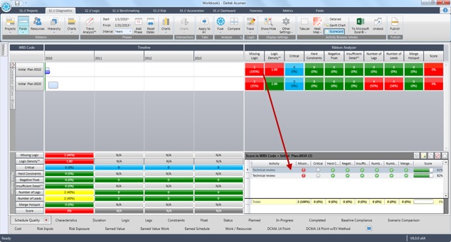 You can take this analysis a step further by focusing on ACom and then grouping by WBS. The example below shows the result of this analysis. The WBS Initial Plan.0010 within the group of activities assigned to contractor ACom is the culprit. By then focusing on the metrics highlighted in red, you can determine specifically which activities to focus on. In the example below, you see that the Technical Review activity is the activity with missing logic that is causing the lower score.