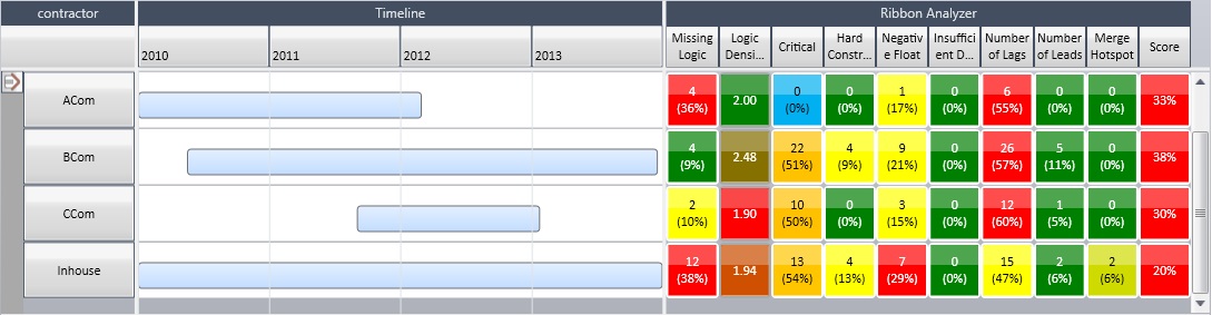 The example below shows the entire project grouped by the field Contractor. The schedule quality metrics are applied to each activity grouping and the score for that group is calculated individually. Based on the view, you can see that ‘ACom’ and ‘Inhouse’ areas of the schedule need work with regards to missing logic (ACom has two activities that are missing logic and causing the lower score of 33%).