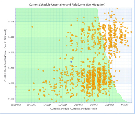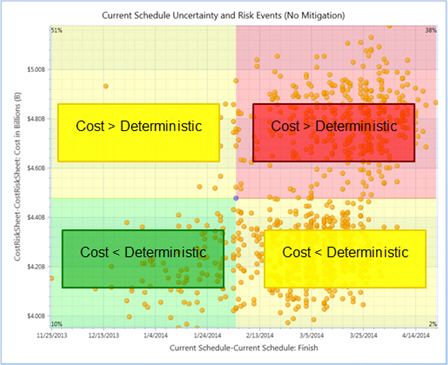 • Deterministic Quadrants provide further insight into the probability of meeting deterministic durations and/or costs. A small portion of all quadrants is visible whether there is data or not. Use the Deterministic Quadrants check box to add/remove the quadrants from the chart.