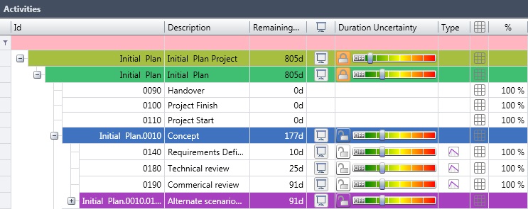 As you assign an uncertainty factor value to any given parent node, all children nodes automatically inherit the same applied Uncertainty Factor category. This top-down inheritance approach results in an extremely fast means of applying uncertainties to large schedules.