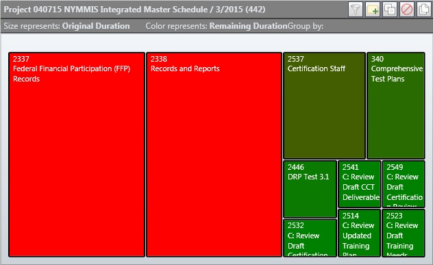 The heat map mode is an extremely powerful visual aid with regards to reporting results. A heat map chart uses relative box size and color to distinguish various attributes of activities. Any activity attribute can be used to define box size, color, and grouping of heat maps charts. In addition, the number of activities shown in a heat map chart can be defined. The heat map example below illustrates: