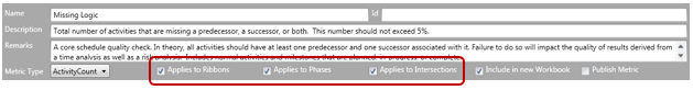 By default, each metric is available in all three analyzers (ribbon, phase, intersection). Optionally, metrics can be excluded from a particular analysis (for example, phase) if, for example, the context is not valid. You can include/exclude metrics from each of the three analyzers by using the three Applies To checkboxes.