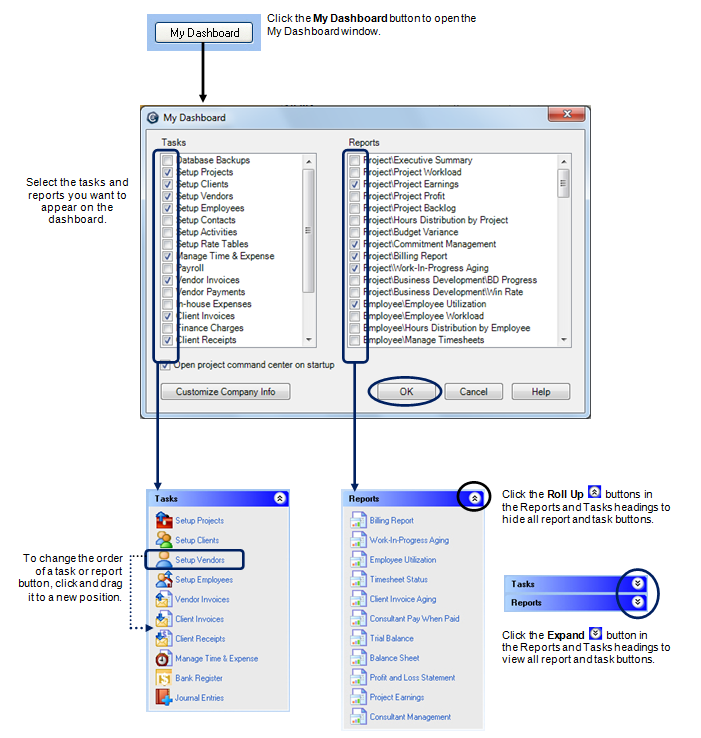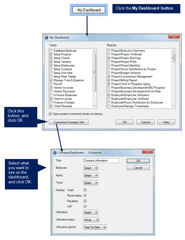 Here's how to add buttons to your dashboard. The options you see in the My Dashboard window depend on your security settings.