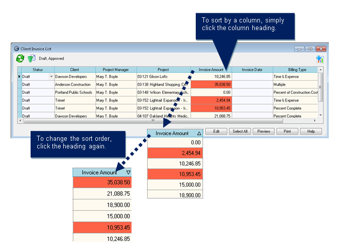 Sort by a columnYou can sort lists and tables according to the information in a column. For example, you may want to see client names alphabetically, or invoices from highest to lowest amount. This type of change remains in effect only until you close the window.