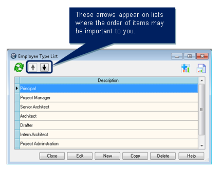 Ajera highlights the best fit for the name or description. Change the orderWhen you see these arrows on a list window, the order of items in the list determines the order that they print on invoices and reports. You'll often see these arrows on lists where you set up information. Any change you make to the order remains in effect until you change it again.
