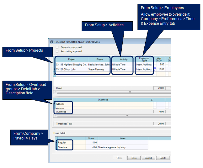 When you set up Ajera, you determine the fields and options that appear on the timesheets. Here's a look at the timesheet and where you set up the various fields that appear on it.
