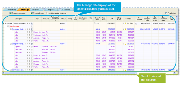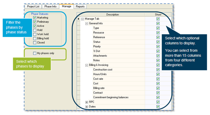 You can then select which optional columns appear on the Manage tab. Columns are grouped in these categories: General Info, Billing & Invoicing, RPC, and Dates.