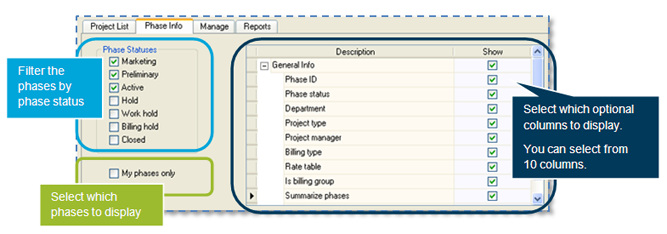On the Phase Info tab, select the phases you want to see in the project tree (for example, your phases only or, the default, all phases). You can filter your phases by phase status (for example, Active, Hold, or Work Hold).