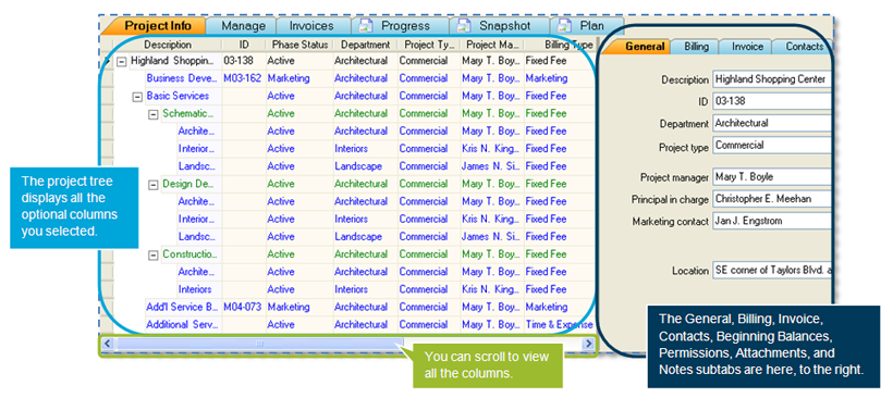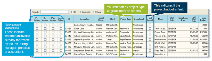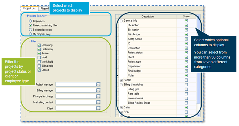 You can then select which optional columns appear in the project list. Columns are grouped in these categories: General Info, People, Billing & Invoicing, Dates, RPC, Hours, and Dollars.