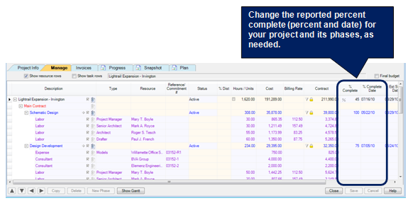 You are here: Courses > A Project Manager's Path through Ajera > Lesson 2: Manage your projects > Update the RPC (% and date) for projects and phases