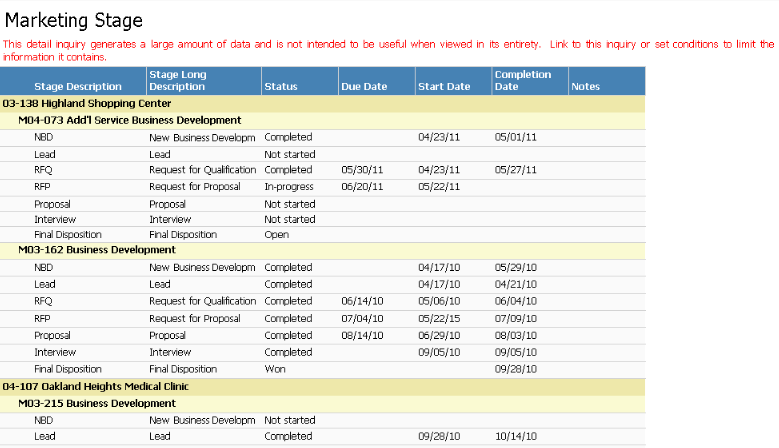 You can produce these inquiries to look at more detail for BD phases and marketing stages. As with all inquiries, you can customize the information by adding and deleting columns, as needed.