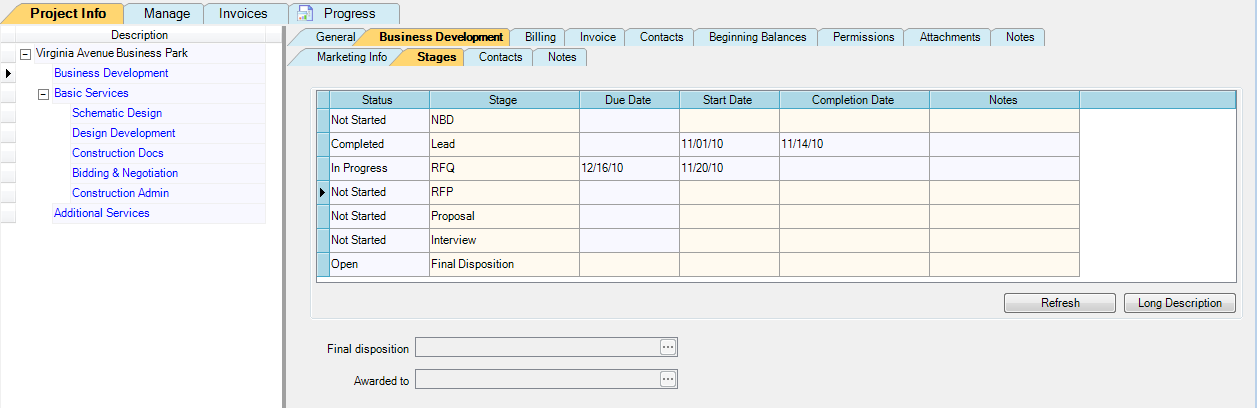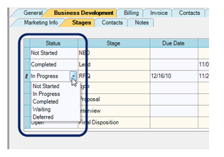 - Click the Business Development phase in the project tree at the left. Then click these tabs: Business Development > Stages.