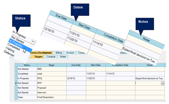 As your BD effort progresses, you update and track your progress as follows: