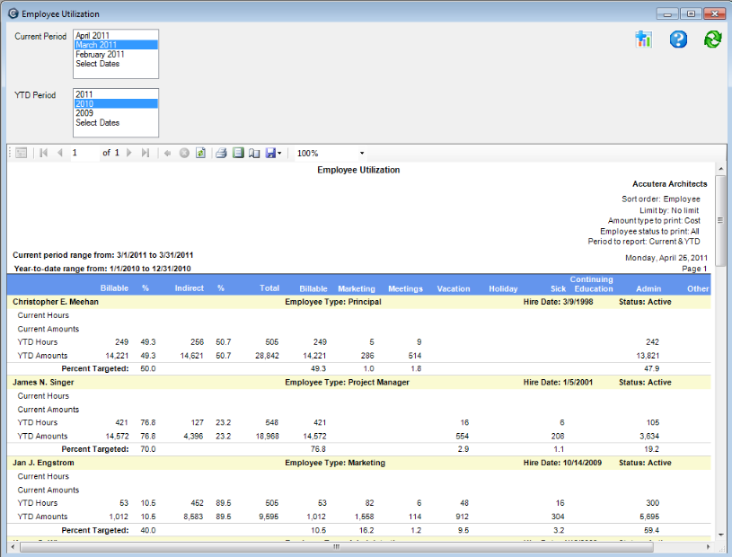 Use the Employee Utilization report to review employee productivity. You can monitor the ratio of billable-to-nonbillable time for each employee, and compare actual billable hours with budgeted hours and the targeted billable percent. You can also see how employees are spending their nonbillable time.