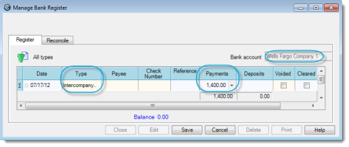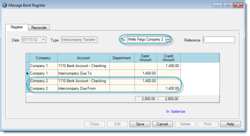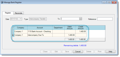 1. In the Manage > Bank Register window, select a bank account that belongs to Company 1. Then do the following: