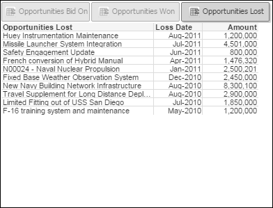 The Opportunities Lost table displays a list of the opportunities for which you most recently failed to win the contract, with the most recent at the top of the list. The table shows the month and year of the loss and the unweighted estimated revenue for each lost opportunity.