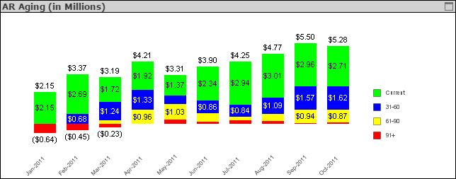 Rounded total AR amounts display above each bar and rounded aging range amounts display in the segments where space allows. For an aging range segment for which no amount displays, position the tip of the mouse pointer over that segment in the bar to display the amount. (Refer to the Trending DSO Detail table on this dashboard to see total AR amounts by period that are exact to the nearest dollar.)