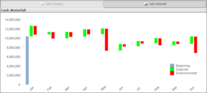 The Cash Waterfall chart provides a graphical representation of the period-by-period impact of deposits and disbursements on your cash balance for the current fiscal year.