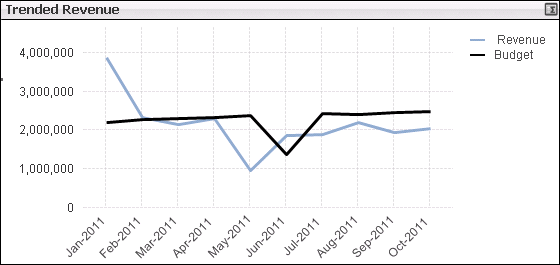 If budget data is loaded into the data model, this chart includes a budget line to give you a quick picture of performance against revenue budget. Use the Display Budgets and Variances option in the lower-left corner of the dashboard to display or hide the budget line.