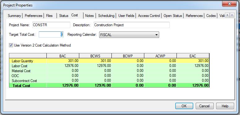 After you create the reporting calendar in Open Plan, open the Project Properties dialog box and click the Cost tab. Select the reporting calendar that matches the Cobra fiscal calendar: