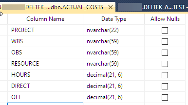 In this example, we are creating a simple database for actual costs using data Format 1 to load actuals (Results are specified as column headers). The columns created should use the same Data Type used throughout Cobra for that same value. For example, in the CAWP table, the CA1 (WBS) field is NVARCHAR (59, not null). The WBS field in the Actuals table should use the same data type setting.