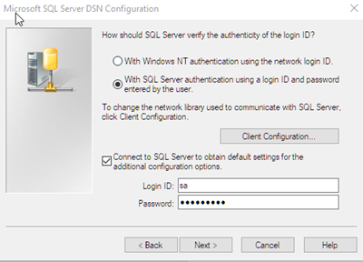 In this example, SQL Server authentication is used.