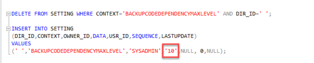 Configure the BackupCodeDependencyMaxLevel Setting