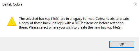 Note: Backup files created prior to Cobra 8.5 used the legacy file extensions. Cobra saves a copy of the file in legacy file extension before it proceeds with the Restore process. When the Restore process completes, the Cobra file is restored with the corresponding BK file extension based on Cobra file type.