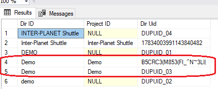 Having multiple rows with the same case and value in the Project ID and Dir ID columns indicates duplicate records. You need to address these duplicates so that only one row remains with the same case and value in both the Dir ID and Project ID columns. In the example above, one of the Demo projects highlighted in red must be updated, as it is marked as a duplicate of the other.