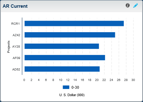 Hover over a bar to display a tooltip containing the project name and the actual AR amount represented by that bar. Click a bar to open the View Receivables and Collections screen, where you can view invoices that have been outstanding for 0-30 days for a particular project.