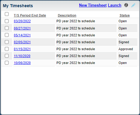 - Launch: This link displays only if you have not selected any check box corresponding to the timesheets. Click this link to open the Timesheet screen.
