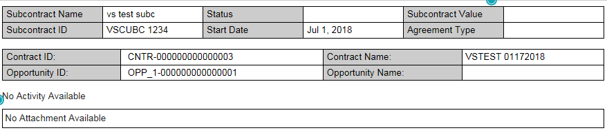 The Subcontract Drill-Thru report displays subcontract details about a customer. You can see this drill-thru when you click the Subcontract # on the Contract Drill-Thru report.