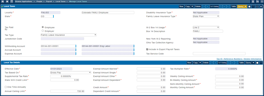 Local Tax code to represent the employer-paid Colorado FAMLI tax and enter the following, and then set other local values as needed: