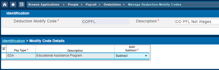 On the Manage Deduction Modify Codes screen, you can set up any pay types that should not be used to calculate the Colorado FAMLI deduction amount.