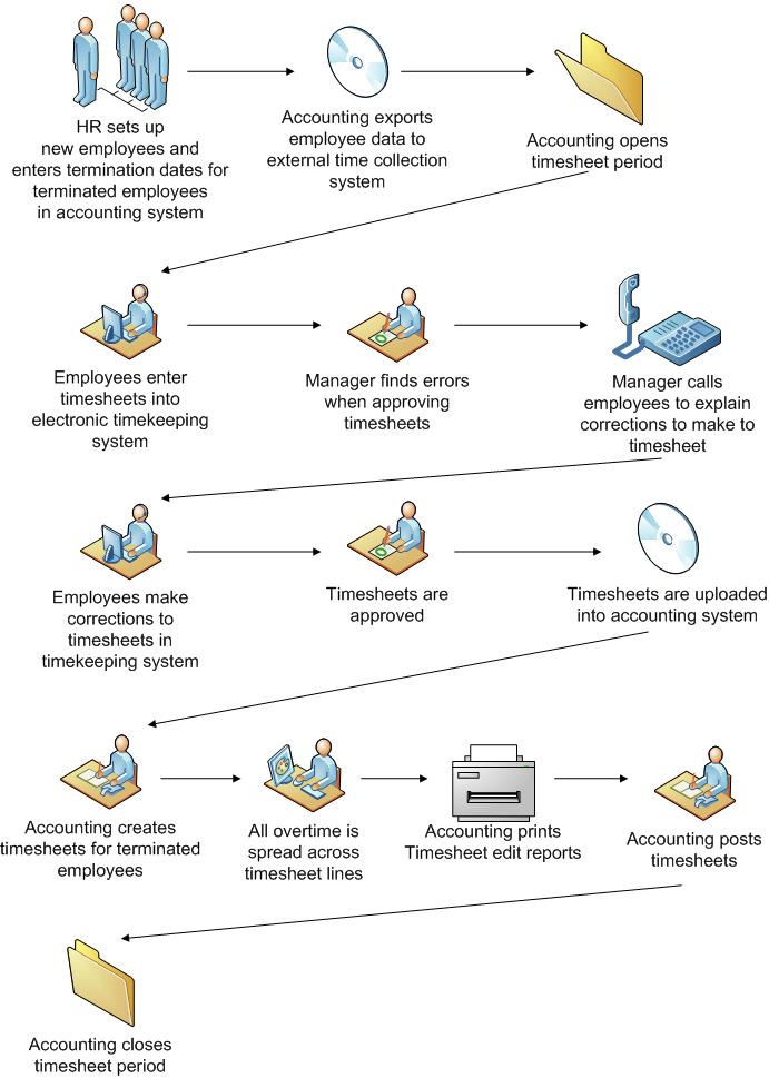 The labor process involves human resources, accounting, employees, and manager tasks.
