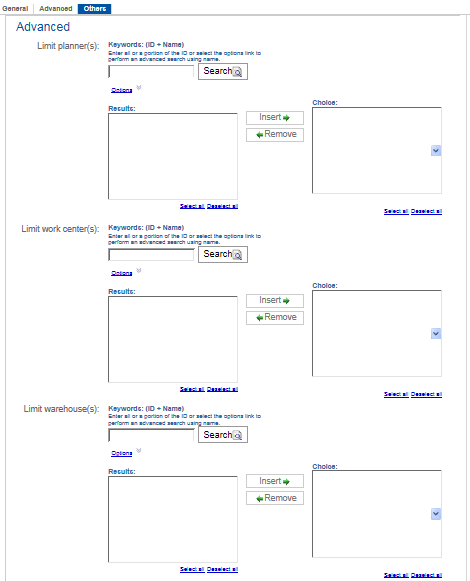 In the Keywords: (ID + Name) field, enter a portion or the entire ID of one or more warehouses to add on the report.