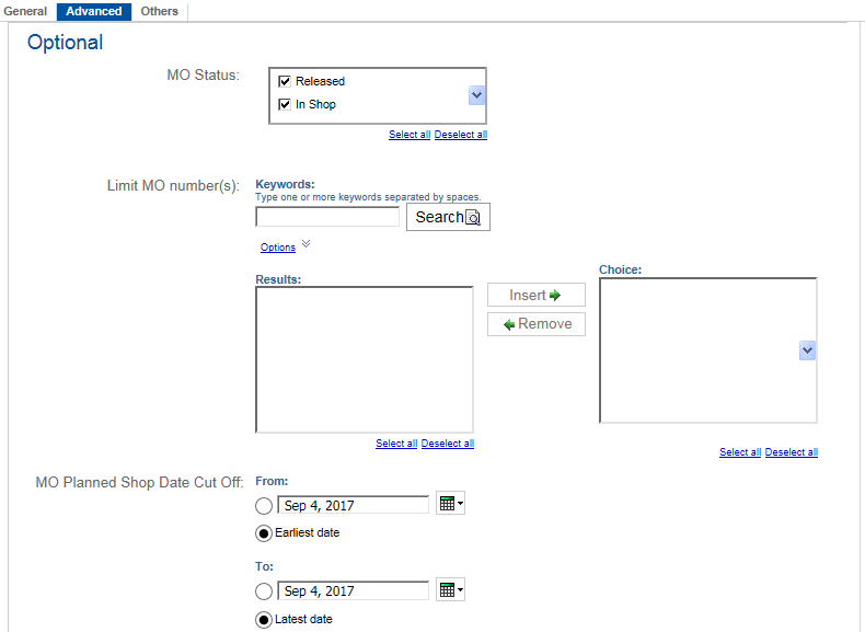 In the Keywords field, enter a portion of one or more MO numbers to add on the report and then click .