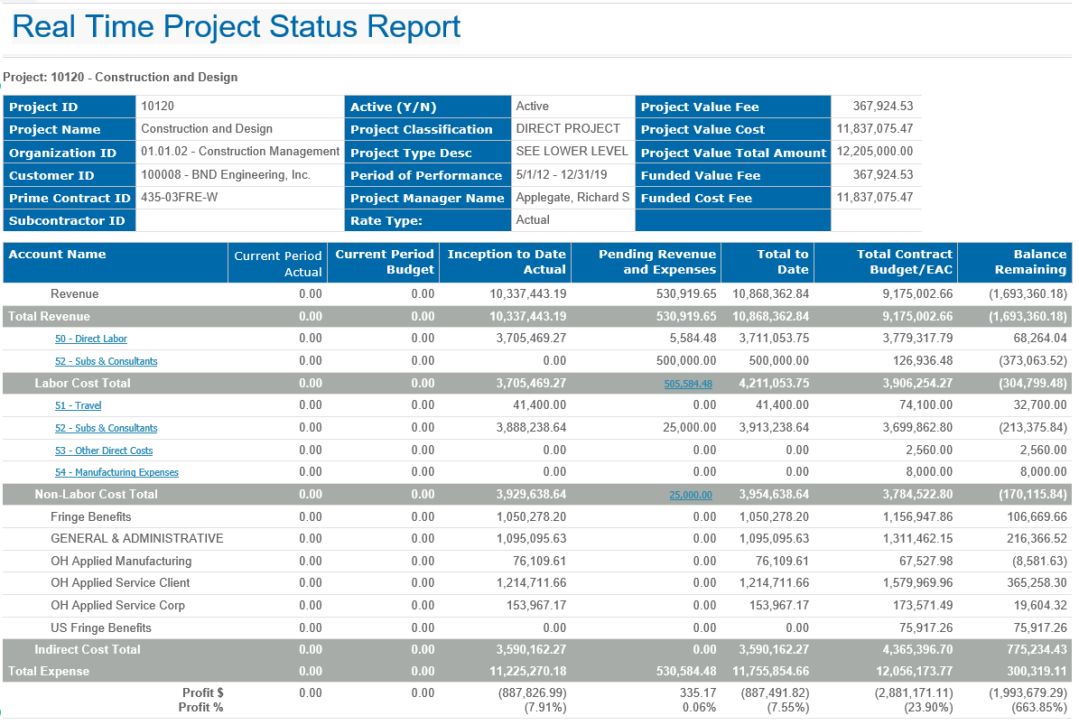 This is a sample of the Real Time Project Status report.