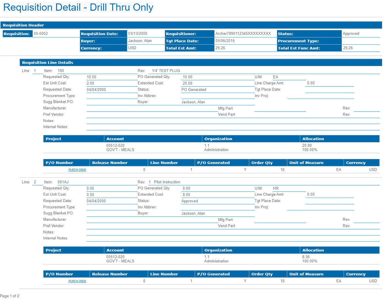 This is a sample Requisition Detail - Drill Thru Only report.