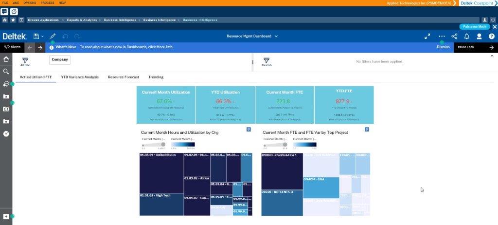 - Resource Forecast: This tab displays the forecasted hours by resource type, forecasted FTE by organization, and analyzes the actual and forecasted utilization by organization based on a six month period.