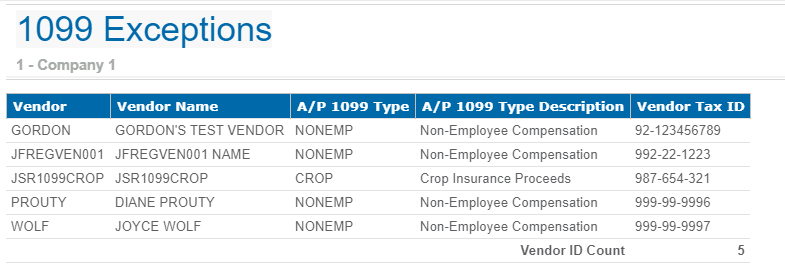Sample 1099 Exceptions report.