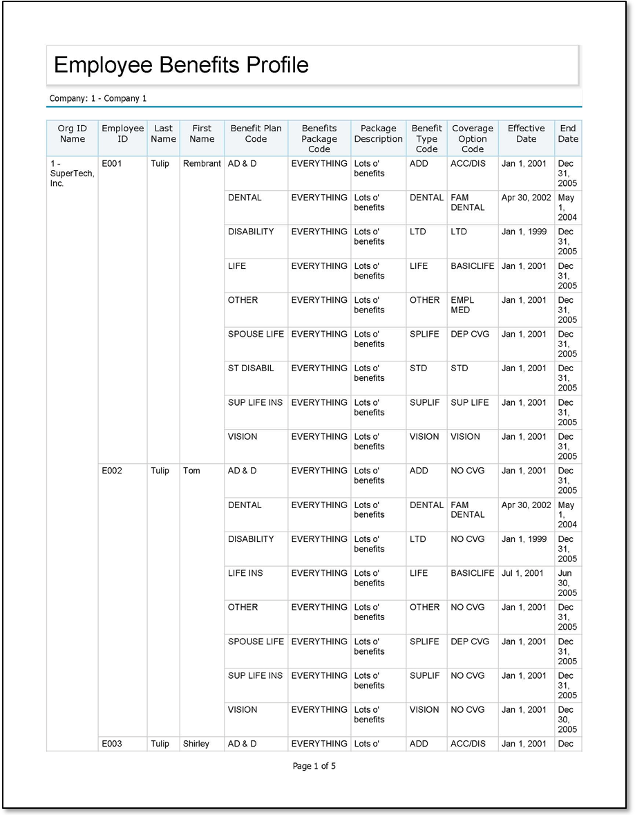Sample Employee Benefit Profile report.