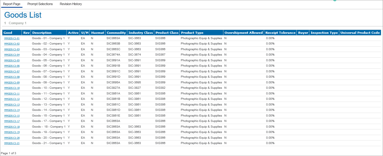 The following is a sample Goods List report.