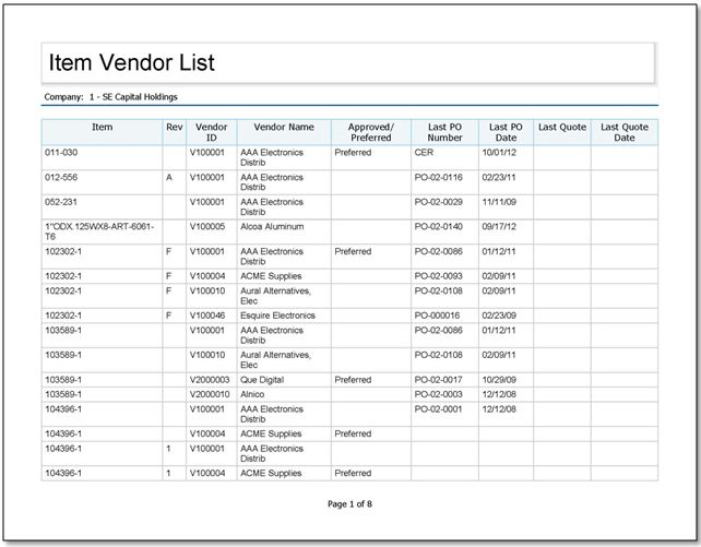 Sample Item Vendor List report.